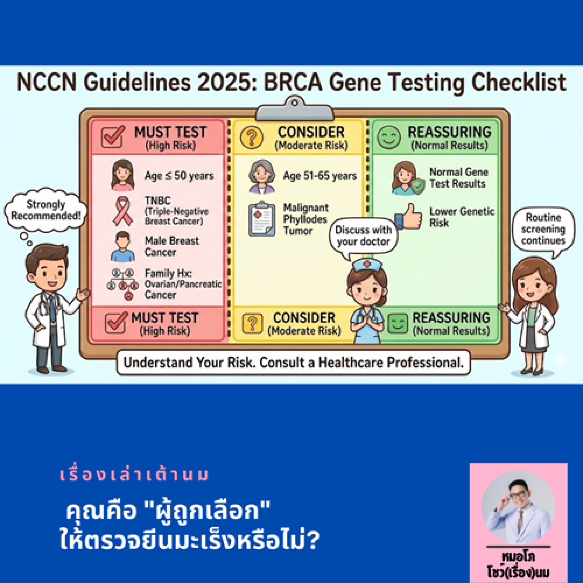 ข้อควรระวัง: ข้อมูลนี้มีวัตถุประสงค์เพื่อให้ความรู้เบื้องต้นเท่านั้น ไม่สามารถแทนที่การวินิจฉัยโรคโดยแพทย์ได้ หากมีประวัติครอบครัวหรือมีความกังวลเรื่องความเสี่ยง ควรรีบมาพบแพทย์เฉพาะทางเพื่อประเมินความเสี่ยงอย่างละเอียดครับ